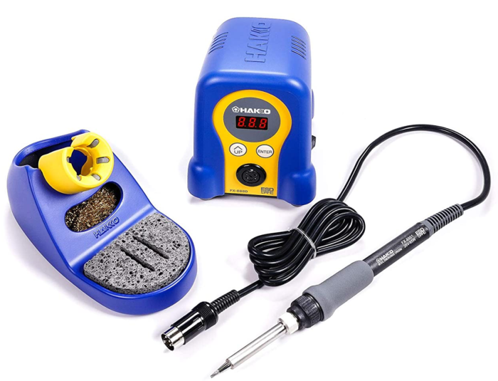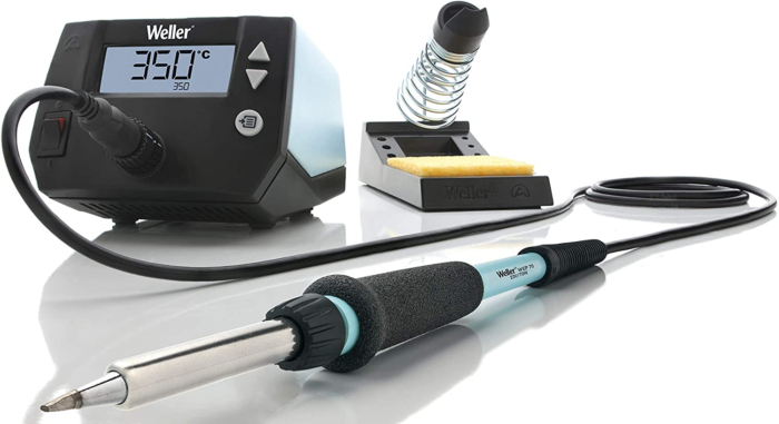 My go to soldering station is a Weller WESD51 Digital Station which costs about $150 at Amazon. [Editors note: That soldering station has been replaced with the Weller WE1010 Digital Soldering Station. We have had great luck with the Tenma Digital Soldering Station. Others prefer the Hakko Digital Soldering Station.]