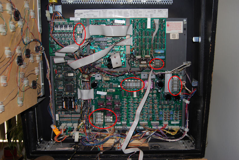 Most of the fuses in a pinball game are located in the backbox (see Image 3).  In some cases fuses will be mounted directly on the backbox (see Image 4) rather than on the boards.  The AC line will also have a fuse (see Image 5) and some games will have fuses mounted under the playfield for magnets and other special items.