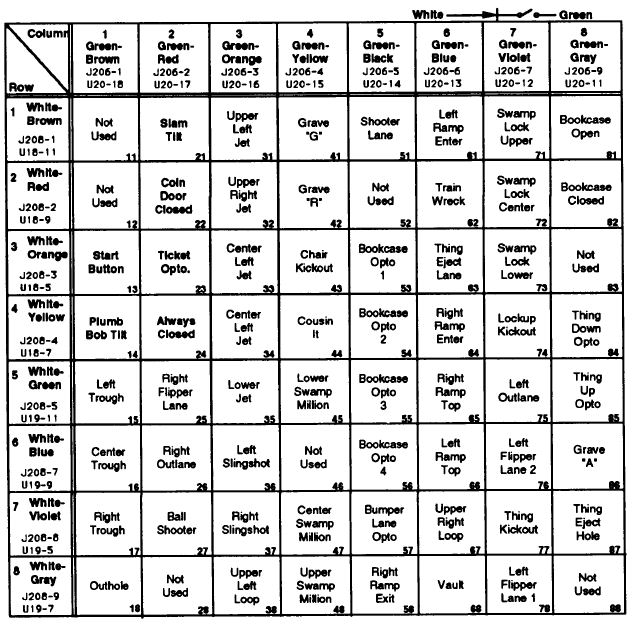 Note: Switch columns and rows are not wired in the same order as they are shown on the switch matrix.  For example in column 6 the physical wire might go from “Left Ramp Enter” to “Thing Eject Lane” to “Train Wreck.”