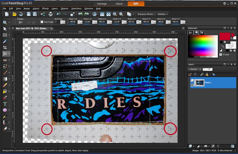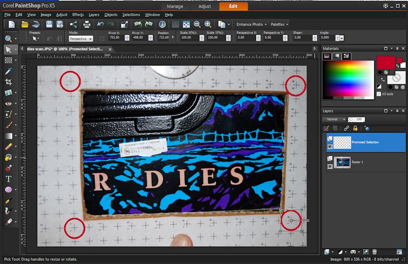 Open the graphic in PaintShop [Editor: Or Photoshop, or Gimp which work similarly] and select the perspective tool. This will bring up a rectangle where each corner can be dragged around the screen. Grab each corner of the perspective rectangle and drag it to each of the four cross-hairs (see Image 3).