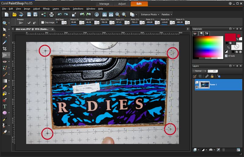 In Image 2 I have highlighted the four cross-hairs in red and you can clearly see how the right side of the rectangle on our photo grid is shorter than the left side. This is the camera distortion we will be removing with PaintShop Pro (most graphic editing programs will have a perspective correction tool).
