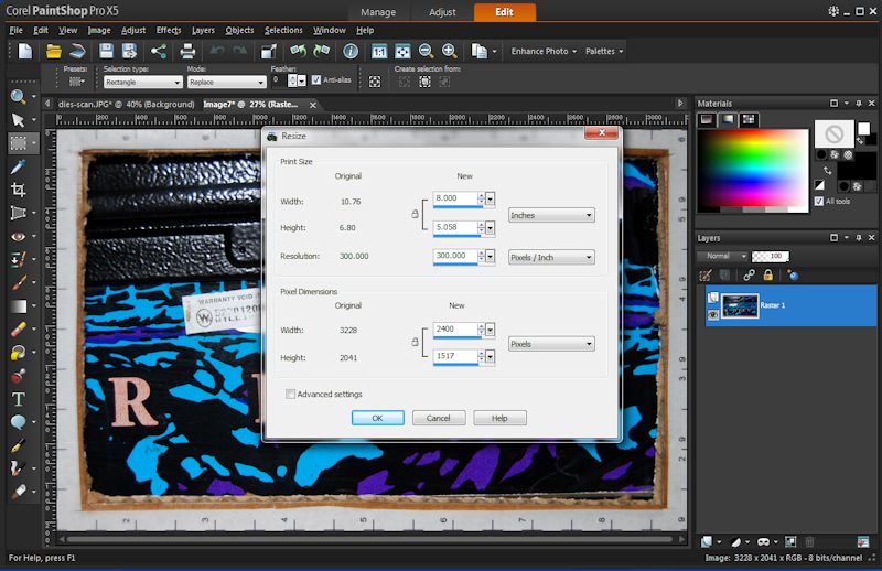 It’s likely you will not get the height and width to match exactly. In my case when I selected a width of 8″ the height came out to 5.058″ (the software sets the height automatically since the aspect ratio is locked). This can only be fixed by unlocking the aspect ratio and setting both width and height seperately. Of course this will cause other problems so we’ll call 5/100 of an inch close enough.