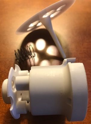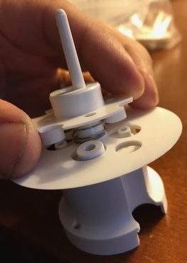 If everything is oriented properly, the body will be held, by friction, snugly to the base, with the spring and skirt in between them. The outer holes in the skirt will be aligned with the indentation in the body, so that the metal ring can fit down in place (last photo).