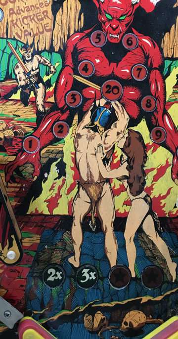 In photos 11 – 13, we have an Gottlieb Play Ball. This had a layer of filth on it along with yellowed lacquer. Removing that not only removed most of the damage, but it also brightened the colors. There were a couple of spots that required small decals.