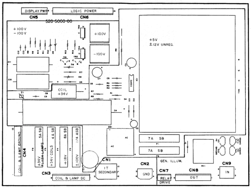 Note: If you have replaced the original displays with LED or LCD, then the high voltage section should be disabled by removing the proper fuse.  On DMD power supply boards, these are F4 and F7.  On Alpha Numeric displays, this is F3.  Place a label stating that this fuse should not be replaced.