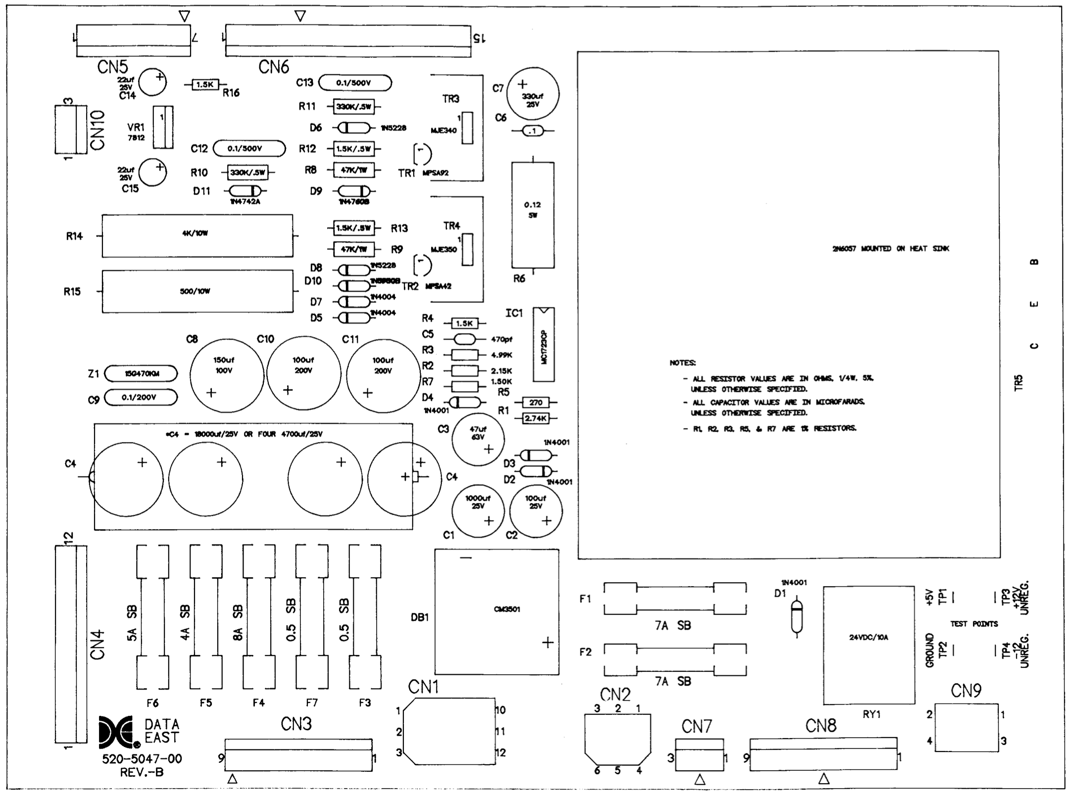 Note that the DE/Sega circuit is nearly identical to the Williams System 11 circuit.  Williams was nice enough to record the proper voltages on the circuit diagram which we have included here.  If there are issues with the +5, it is helpful to measure and compare those voltages.  Note: High voltages are nearby on this circuit board.