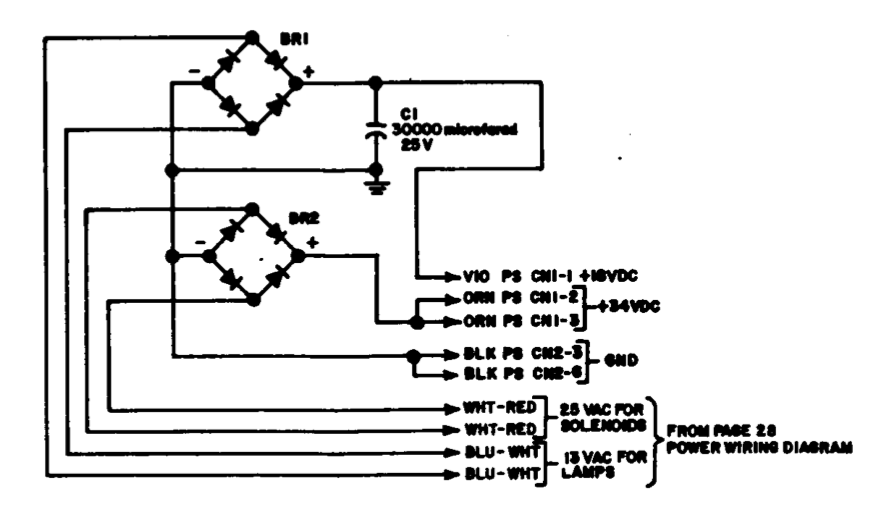 There are also separate bridge rectifiers and capacitors located off the boards in the backbox.